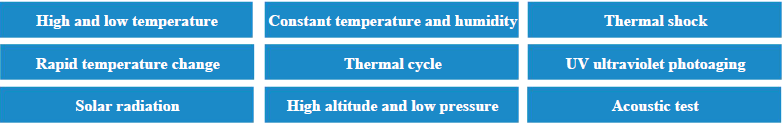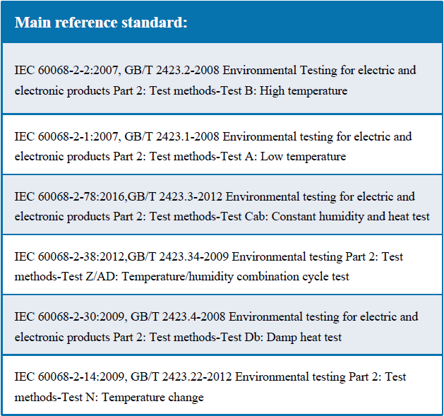 Test projects: high temperature, low temperature, high and low temperature cycle, damp heating test, constant humidity and heating test