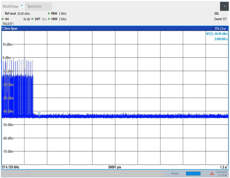 檢測(cè)到AWGN信號(hào),EUT停止傳輸, 測(cè)試?yán)缦拢?/span>