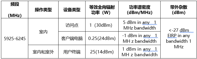 2. 該頻段僅限于室內(nèi)使用設(shè)備,接入點(AP)或附屬設(shè)備(SD)的最大功率為30 dBm EIRP,EIRP頻譜密度為5 dBm/MHz。