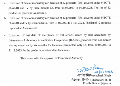 印度電信工程中心(TEC)于2023年9月27日發(fā)布通知,延長MTCTE第3階段和第4階段產(chǎn)品的強(qiáng)制認(rèn)證日期。