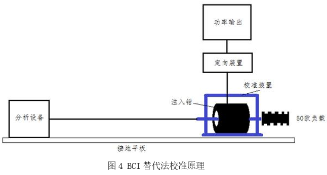 BCI試驗(yàn)系統(tǒng)的基本組成及校準(zhǔn)原理,如圖4所示。由功放通過(guò)定向耦合器向注入鉗輸出功率,再由校準(zhǔn)裝置進(jìn)行耦合感應(yīng),校準(zhǔn)裝置端接50Ω負(fù)載,另一端輸出至功率計(jì),讀取注入功率參數(shù)。