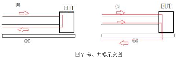 在共模注入CBCI和差模注入DBCI中,所注入電流的能量和干擾路徑是不同的,兩種試驗(yàn)結(jié)果也會(huì)產(chǎn)生較大差異。如圖7所示,差模注入(DBCI)的特征是噪聲在線束與線束之間形成回路,回流路徑基本是阻抗較低的線束或通路,通常是地線。共模注入(CBCI)的特征是噪聲在線束與地之間形成回路,通過(guò)空間耦合與地形成回路。從上圖中可以看出差模與共模整個(gè)回路是完全不同的,即使是同一被測(cè)樣品,兩種測(cè)試方法,也可能存在不同的試驗(yàn)結(jié)果。