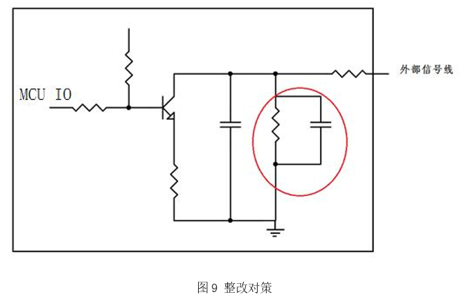 如下圖9所示,在信號(hào)線輸出端口增加一級(jí)RC吸收電路,目的為噪聲提供一個(gè)低容性回路,將線束上的交變能量就近進(jìn)行泄放,使噪聲電路不再通過(guò)IO電路被注入到MCU形成干擾。