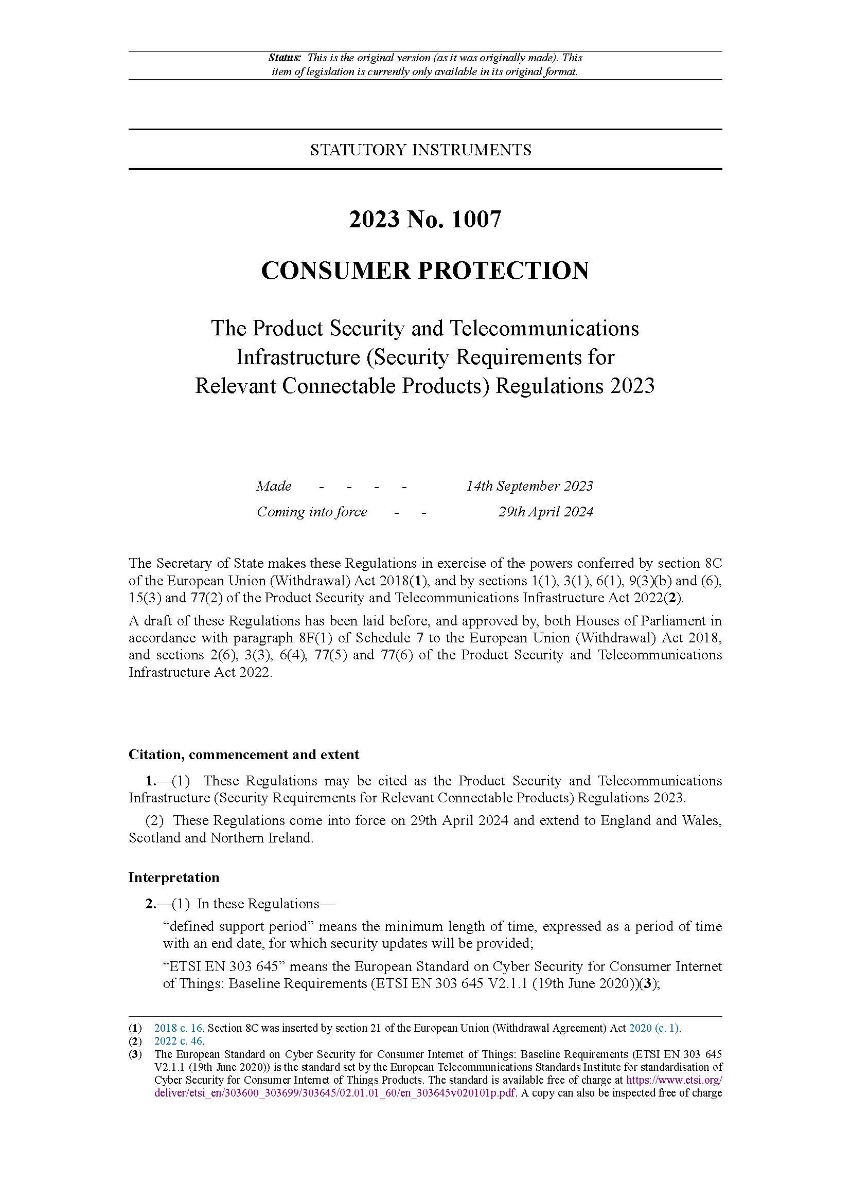 2023年10月,英國政府宣布PSTI法規(guī)即《產(chǎn)品安全和電信基礎(chǔ)設(shè)施(相關(guān)可連接產(chǎn)品的安全要求)法規(guī)2023》(英文:The Product Security and Telecommunications Infrastructure (Security Requirements for Relevant Connectable Products) Regulations 2023),于2023年9月14日正式立法。