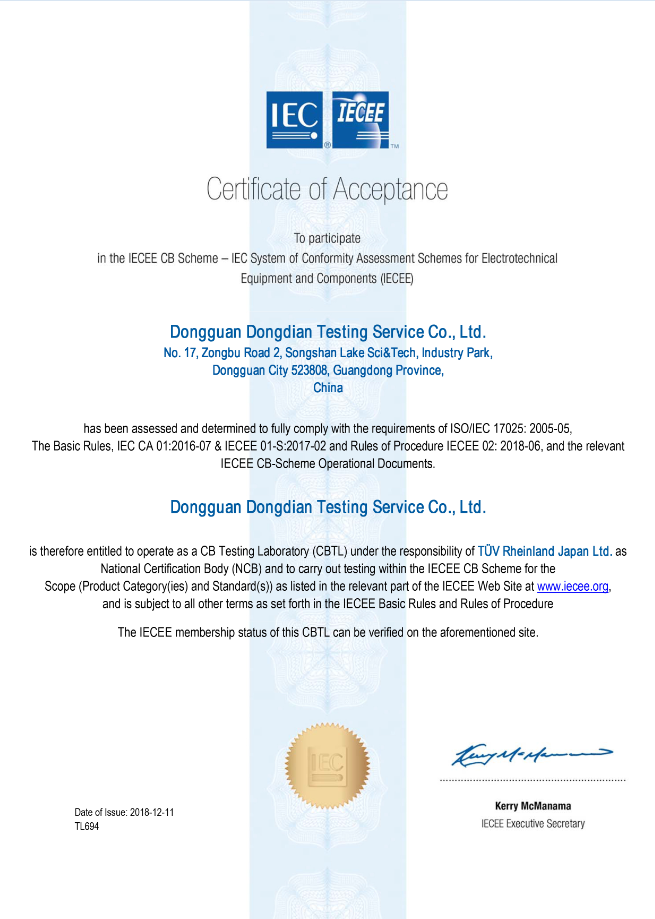 2018年9月11日,東莞市東電檢測(cè)技術(shù)有限公司順利通過IECEE CBTL的評(píng)審。于12月11日獲得TüV Rheinland CBTL的授權(quán)資質(zhì)。來(lái)自IECEE和NCB的技術(shù)專家對(duì)東電檢測(cè)實(shí)驗(yàn)室的人員、設(shè)備、環(huán)境條件、檢測(cè)能力及質(zhì)量體系運(yùn)行情況等進(jìn)行了全面、嚴(yán)謹(jǐn)、細(xì)致的評(píng)審。
