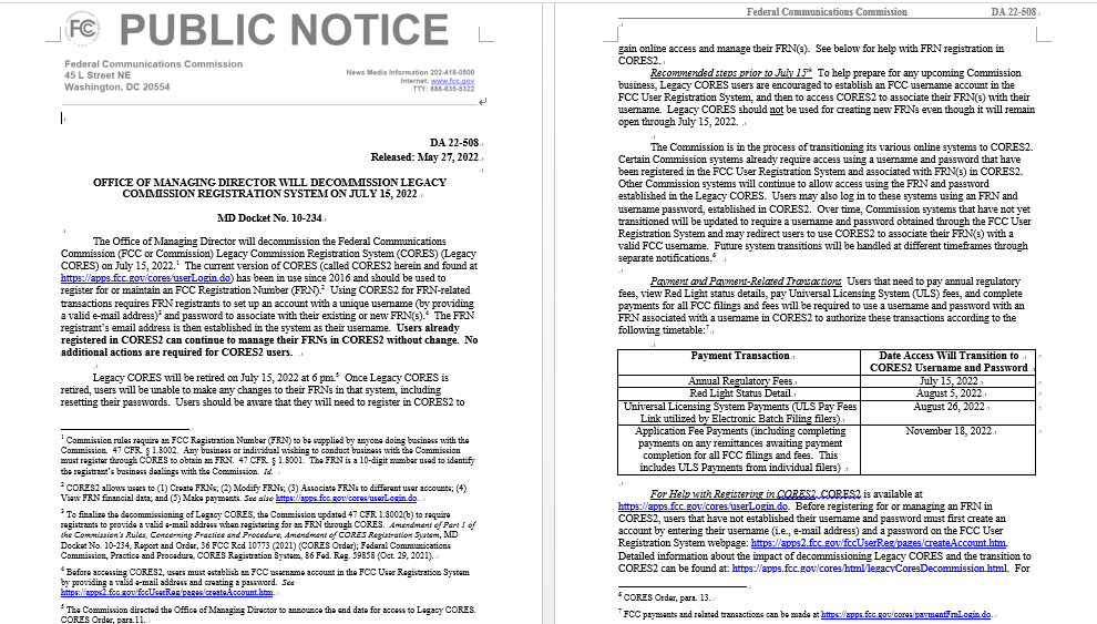 近期FCC發(fā)布官方信息,將于2022年7月15日關(guān)閉舊的FRN注冊(cè)系統(tǒng)the legacy Commission Registration System(簡(jiǎn)稱CORES),開始使用新版本的系統(tǒng)CORES2。