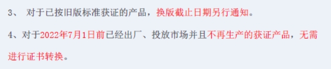 對(duì)于已獲證的產(chǎn)品,以下CQC官方宣貫文件截圖供參考。目前是EMC標(biāo)準(zhǔn)換版,對(duì)于已獲證且還需要生產(chǎn)出貨的則需要進(jìn)行標(biāo)準(zhǔn)換版,但暫時(shí)還沒(méi)有設(shè)立過(guò)渡期。
